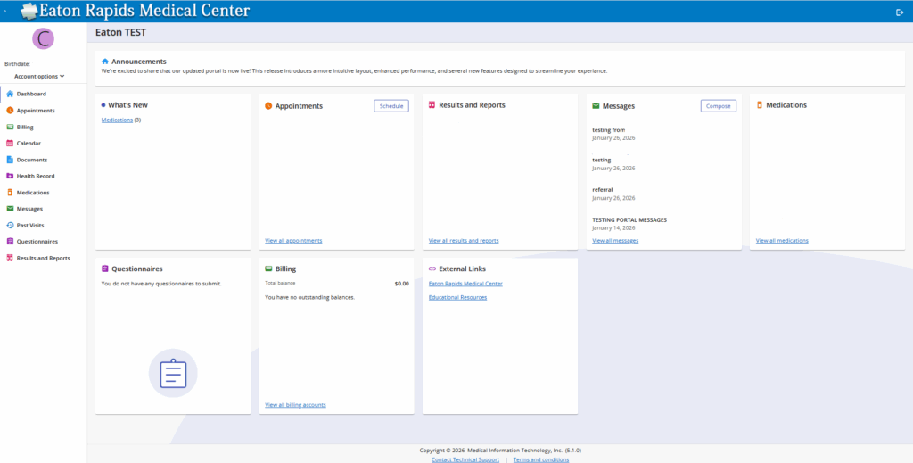 The updated portal features a cleaner layout, improved navigation, and a more user-friendly experience across desktop and mobile devices. Patients can easily access important health information, communicate securely with their care team (Family Practice), view appointments, view test results, and view billing all in one convenient place.